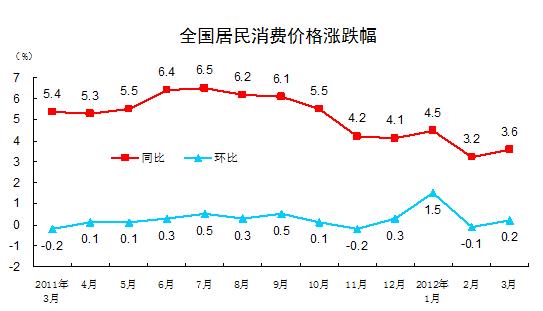 4月9日,國家統計局公布數據顯示,3月份居民消費價格指數(CPI)同比上漲3.6%,環比上漲0.2%,高于此前市場的普遍預期值。與此同時,3月份工業生產者出廠價格指數(PPI)同比下降0.3%,這是PPI同比增速自2009年11月之后首次出現負增長,創28個月以來的歷史新低。不過,3月份PPI環比增幅則為0.3%,2月份PPI環比上漲0.1%,連續兩個月出現環比上漲。