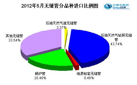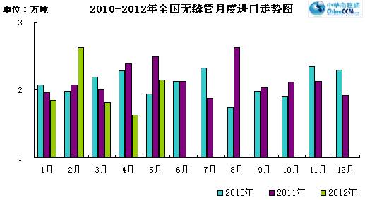 2012年5月份進口無縫管2.15萬噸,比去年同期少進口0.34萬噸,同比下降13.65%。5月份進口環比上月增加0.53萬噸,環比增長32.7%。2012年1-5月份累計進口無縫管10.05萬噸,同比降低7.93%。