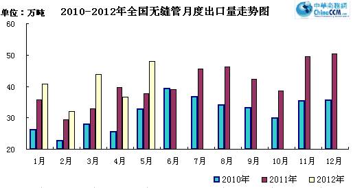 2012年5月份出口無縫管48.02萬噸,比去年同期少出口10.42萬噸,同比降低27.4%。5月份出口量環比4月份增加11.33萬噸,環比增長30.88%。1-5月份累計出口無縫管201.34萬噸,同比增長14.71%。