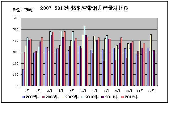 據中華商務網監測數據顯示,2012年11月份國內熱軋窄帶鋼產量378.4萬噸,環比上月394.9萬噸減產16.5萬噸,日均產量12.61萬噸,日均環比減少1.02%;比去年同期產量335.7萬噸增產42.7萬噸,同比增長12.72%。十一月份國內天氣正值進入冬季,下游對帶鋼的需求也漸進入淡季,需求將進一步萎縮。正因如此,國內熱軋窄鋼帶產量從十月份開始明顯減少,十月、十一月份產量逐漸遞減。緩和了國內帶鋼供需壓力,同時也支撐市價。