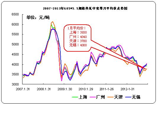據(jù)中華商務(wù)網(wǎng)監(jiān)測數(shù)據(jù)顯示,2013年1月我國11個主要市場熱軋中寬帶月平均價格3937元/噸,與上月相比漲87元/噸。其中天津、無錫、上海、廣州四個主要市場1月平均價格分別為3780元/噸、4000元/噸、3930元/噸、4000元/噸,分別較上個月漲100元/噸, 漲60元/噸, 漲30元/噸,漲120元/噸。