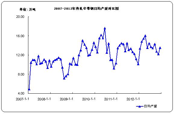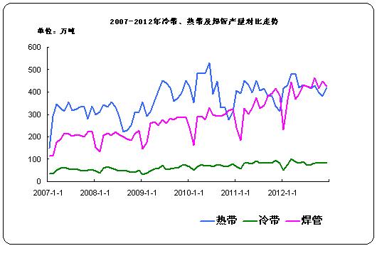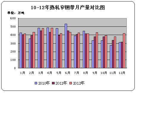 據(jù)中華商務(wù)網(wǎng)監(jiān)測數(shù)據(jù)顯示, 2012年12月份國內(nèi)熱軋窄帶鋼產(chǎn)量420.5萬噸,環(huán)比增產(chǎn)42.1萬噸,日均產(chǎn)量13.56萬噸,日均環(huán)比增長11.06%;比去年同期產(chǎn)量314.4萬噸增產(chǎn)106.1萬噸,同比增長33.75%。2012年12月我國冷軋窄帶產(chǎn)量82.9萬噸,環(huán)比減產(chǎn)4.5萬噸,日均產(chǎn)量2.67萬噸;比去年同期產(chǎn)量82.4萬噸增產(chǎn)0.5萬噸。
