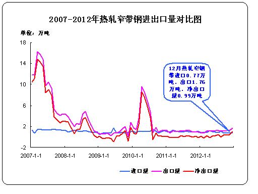 據(jù)中華商務(wù)網(wǎng)監(jiān)測數(shù)據(jù)顯示, 2012年12月份進(jìn)口熱軋窄帶鋼0.77萬噸,出口1.76萬噸,凈出口0.99萬噸。12月份新增資源量419.51萬噸。