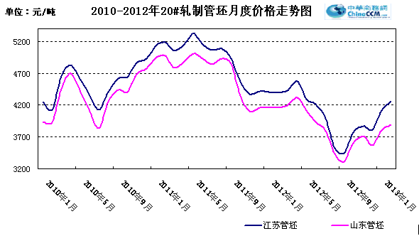中商網訊:2月江蘇20#軋制管坯月均報價4261元/噸,和上月月均報價相比上漲141元/噸,山東20#軋制管坯報價3892元/噸,比上月月均報價上漲了92元/噸。分時間段來看,年前管坯價格大幅走高,年后盤整運行。作為冶金原料之一的鐵礦石價格漲后小幅下挫,現京唐港進口的63.5%品味的印度粉礦1070-1080元/噸,鐵礦石價格的高企對鋼材價格起到一定的成本支撐。從其下游來看,無縫管市場價格穩中小幅上漲,市場成交低迷,貿易商操作謹慎,管廠成本及庫存的壓力均很大,對管坯價格上漲起到一定的抑制作用。在成本價格的支撐下,短期內管坯價格穩中波動運行的可能性較大。