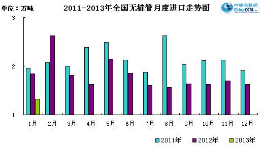 雖然2013年1月份并未因?yàn)榇汗?jié)長假的到來而造成實(shí)際工作日減少,但是需求減弱造成的季節(jié)性減產(chǎn)導(dǎo)致1月份國內(nèi)無縫管產(chǎn)量較2012年12月份有所降低。2012年12月份國內(nèi)無縫管產(chǎn)量250萬噸,考慮到1月份的減產(chǎn)情況,我們估計(jì)2013年1月份國內(nèi)無縫管產(chǎn)量將維持在200萬噸左右的水平,同比將有所增長。