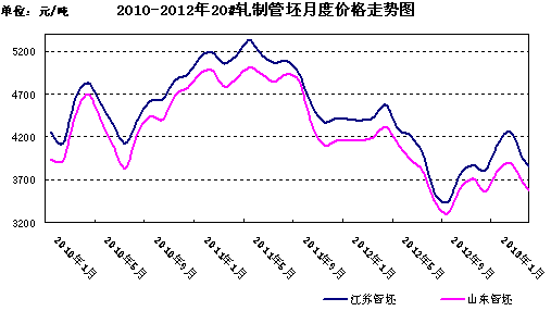 4月江蘇20#軋制管坯月均報價3792元/噸,和上月月均報價相比下調150元/噸左右,山東20#軋制管坯報價3526元/噸,比上月月均報價下調140元/噸。分時間段來看,上旬管坯價格持續(xù)下行,中旬出現(xiàn)小幅上調的趨勢,下旬繼續(xù)下行。作為冶金原料之一的鐵礦石價格盤整運行,現(xiàn)京唐港進口的63.5%品味的印度粉礦970-980元/噸,鐵礦石價格對鋼材價格起到一定的支撐作用。從其下游來看,無縫管市場價格持續(xù)小幅走低的趨勢,成交和前期相比有所好轉,但因產(chǎn)量持續(xù)走高,貿易商操作仍顯謹慎,管廠庫存壓力很大,無縫管出廠價格仍以下調為主。管坯需求對其價格拉動力度不足,但原料價格起到一定的支撐作用,管坯價格處于上漲無力下跌無空間的狀況。預計短期內管坯價格持續(xù)弱穩(wěn)觀望的態(tài)勢。