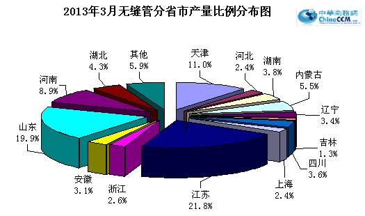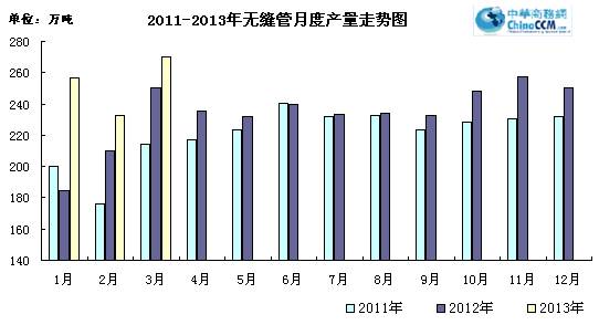 3月份國內無縫管產量269.8萬噸,比去年同期多生產16.6萬噸,同比增長6.6%。環比2月份增產37.4萬噸,環比增長16.09%。2013年一季度國內無縫管累計產量705.7萬噸,同比增長6.9%。