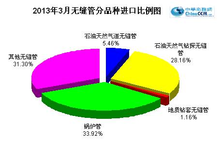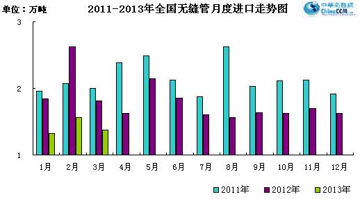 2013年3月份進口無縫管1.38萬噸,比去年同期少進口0.43萬噸,同比下降23.76%。3月份進口環比上月降低0.18萬噸,環比下降11.54%。2013年一季度累計進口無縫管4.44萬噸,同比下降29.2%。