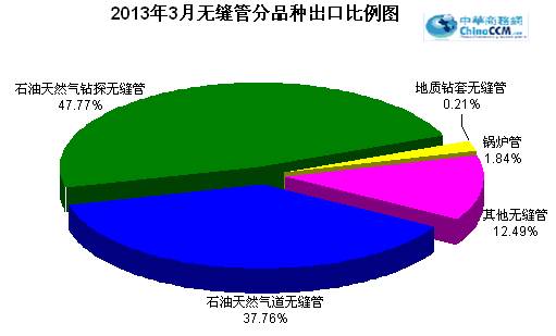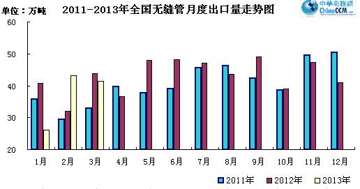 2013年3份出口無縫管41.53萬噸,比去年同期少出口2.27萬噸,同比下降5.18%。3月份出口環比2月份減少1.73萬噸,環比降低4%。2013年一季度累計出口無縫管128.99萬噸,同比增長10.39%。