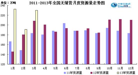 3月份國內無縫管新增資源量229.65萬噸,比去年同期增加21.54萬噸,同比增長10.35%。環比2月份增加38.95萬噸,環比增長20.4%。2013年一季度無縫管累計新增資源量634.65萬噸,同比增長18.8%。