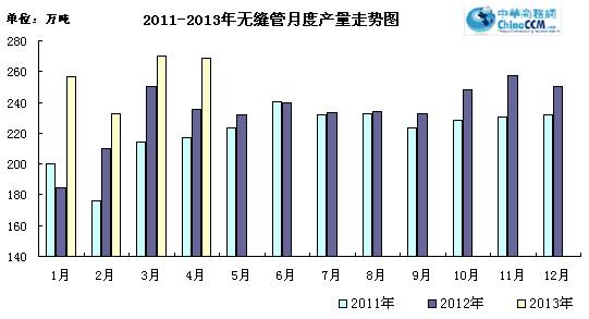 4月份國內(nèi)無縫管產(chǎn)量268.7萬噸,比去年同期多生產(chǎn)28.8萬噸,同比增長12%。環(huán)比3月份減產(chǎn)1.1萬噸,環(huán)比下降0.4%。2013年1-4國內(nèi)無縫管累計(jì)產(chǎn)量976萬噸,同比增長9.7%。