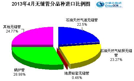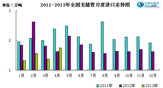 2013年4月份進(jìn)口無縫管1.75萬噸,比去年同期多進(jìn)口0.13萬噸,同比增長8.02%。4月份進(jìn)口環(huán)比上月增加0.37萬噸,環(huán)比增長26.8%。2013年1-4累計(jì)進(jìn)口無縫管6.18萬噸,同比下降21.69%。