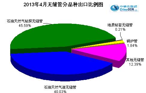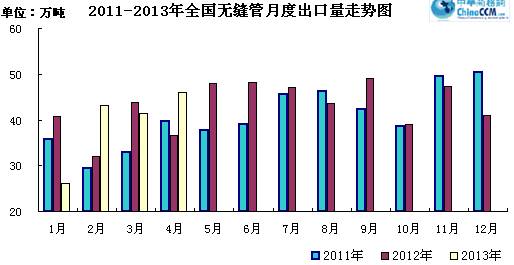 2013年4份出口無縫管45.93萬噸,比去年同期多出口9.24萬噸,同比增長25.18%。4月份出口環(huán)比3月份增加4.4萬噸,環(huán)比增長10.59%。2013年1-4月份累計(jì)出口無縫管174.93萬噸,同比增長14.09%。