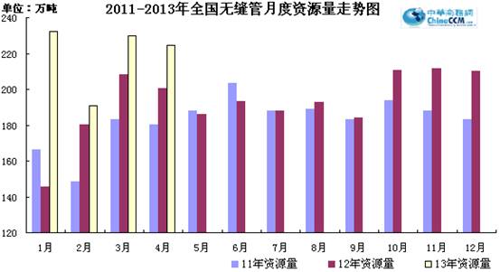 4月份國內(nèi)無縫管新增資源量224.52萬噸,比去年同期增加24.09萬噸,同比增長12.02%。環(huán)比3月份減少5.13萬噸,環(huán)比下降2.23%。2013年1-4月份無縫管累計(jì)新增資源量859.17萬噸,同比增長16.98%。