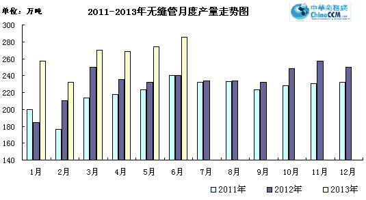中商網訊:2013年6月份無縫管產量285.3萬噸,同比增產45.4萬噸,同比增長18.9%;環比增產11.1萬噸,環比增長4.05%。
