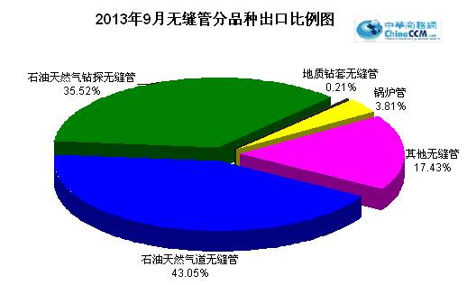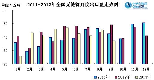 2013年9份出口無縫管37.19萬噸,比去年同期少出口11.97萬噸,同比下降24.35%。9月份出口環比8月份減少7.94萬噸,環比下降17.59%。2013年1-9月份累計出口無縫管387.84萬噸,同比下降0.4%。(參見:圖五、圖六)
