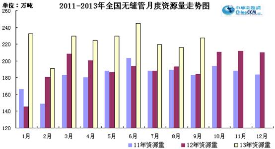 9月份國內無縫管新增資源量227.45萬噸,比去年同期增加42.57萬噸,同比增長23.02%。環比8月份增加11.19萬噸,環比增長5.17%。2013年1-9月份無縫管累計新增資源量1996.85萬噸,同比增長18.77%。