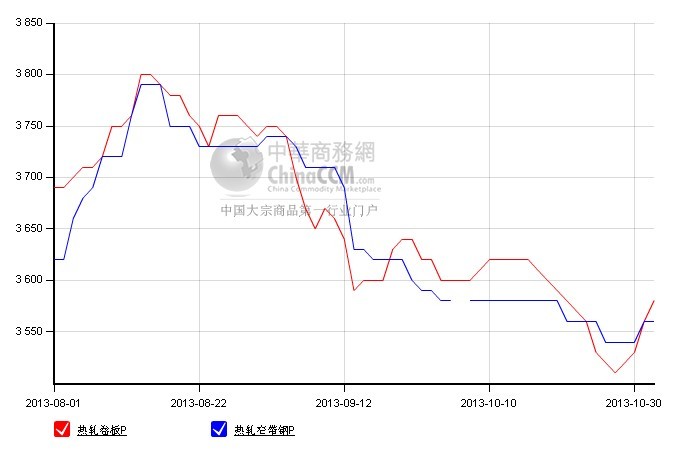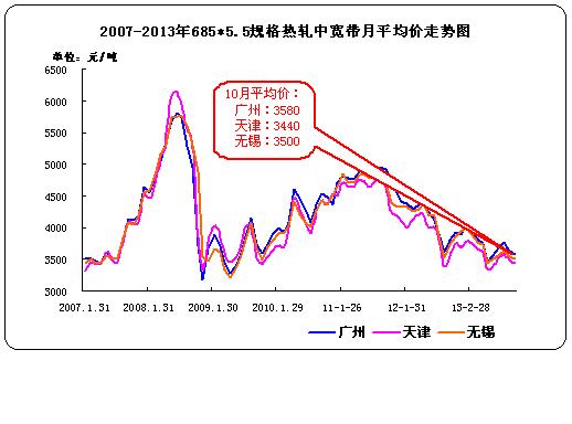 據(jù)中華商務(wù)網(wǎng)監(jiān)測(cè)數(shù)據(jù)顯示,2013年10月我國(guó)11個(gè)主要市場(chǎng)熱軋中寬帶月平均價(jià)格3505元/噸,與上月相比跌46元。其中天津、無(wú)錫、廣州四個(gè)主要市場(chǎng)10月平均價(jià)格分別為3440元/噸、3500元/噸、3580元/噸,分別較上個(gè)月跌40元/噸,跌50元/噸,跌50元/噸。