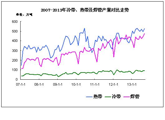 據(jù)中華商務(wù)網(wǎng)監(jiān)測(cè)數(shù)據(jù)顯示,2013年9月份國(guó)內(nèi)熱軋窄帶鋼產(chǎn)量525.1萬(wàn)噸,環(huán)比增加30.9萬(wàn)噸,環(huán)比增長(zhǎng)6.25%;日均產(chǎn)量17.5萬(wàn)噸,日均環(huán)比增長(zhǎng)9.79%;比去年同期產(chǎn)量428.6萬(wàn)噸增產(chǎn)96.5萬(wàn)噸,同比增長(zhǎng)22.52%。2013年9月份國(guó)內(nèi)冷軋窄帶鋼產(chǎn)量94.1萬(wàn)噸,環(huán)比增產(chǎn)3.8萬(wàn)噸。