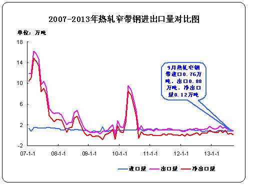 據(jù)中華商務(wù)網(wǎng)監(jiān)測(cè)數(shù)據(jù)顯示, 2013年9月份進(jìn)口熱軋窄帶鋼0.76萬(wàn)噸,出口0.88萬(wàn)噸,凈出口0.12萬(wàn)噸。9月份新增資源量524.98萬(wàn)噸。