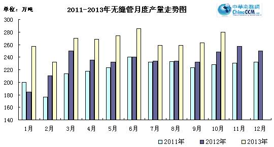 10月份國(guó)內(nèi)無(wú)縫管產(chǎn)量279.1萬(wàn)噸,比去年同期多生產(chǎn)28.5萬(wàn)噸,同比增長(zhǎng)11.3%。環(huán)比9月份增產(chǎn)17.1萬(wàn)噸,環(huán)比增長(zhǎng)6.51%。2013年1-10月份國(guó)內(nèi)無(wú)縫管累計(jì)產(chǎn)量2597.2萬(wàn)噸,同比增長(zhǎng)10.9%。
