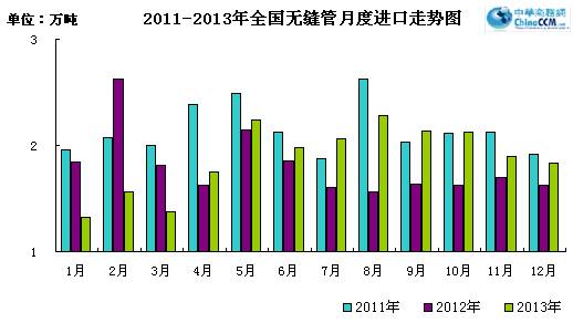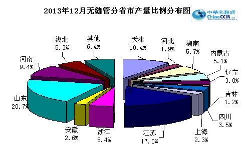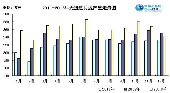 12月份國內生產無縫管242.9萬噸,同比增長0.9%。環比11月份減產24.6萬噸,環比下降9.2%。2013年全年累計生產無縫管2962.8萬噸,同比增長7.6%。