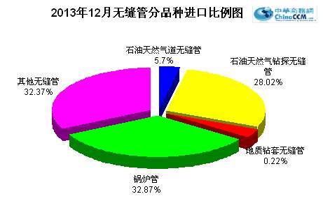 2013年12月份進口無縫管1.84萬噸,同比少進口0.21萬噸,同比下降12.88%。環比11月份少進口0.06萬噸,環比下降3.2%。2013年全年累計進口無縫管22.75萬噸,同比增長4.91%。(參見:圖三、圖四)