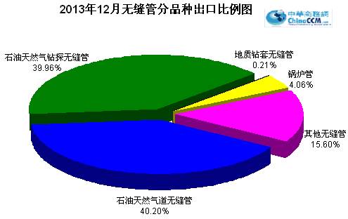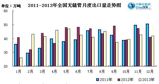 2013年12月份出口無縫管41.93萬噸,同比多出口0.86萬噸,同比增長2.09%。環比11月份少出口0.82萬噸,環比下降1.9%。2013年全年累計出口無縫管511.96萬噸,同比微降0.93%。(參見:圖五、圖六)