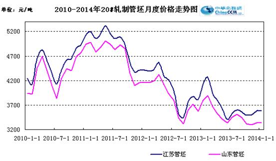 1月江蘇20#軋制管坯月均報價3580元/噸,和上月月均報價持平,山東20#軋制管坯報價3350元/噸,比上月月均報價上調15元/噸。上旬管坯價格維穩運行,中旬出現小幅走低的行情,下旬管坯價格穩中趨弱。作為冶金原料之一的鐵礦石價格小幅下行,現京唐港進口的63.5%品味的印度粉礦880-890元/噸,原料價格上漲無力,鋼材市場觀望情緒更顯濃重。從其下游來看,無縫管市場價格穩中小幅走低,市場成交處于低位,短期內無縫管價格低位暫穩。臨近年底無縫管需求將持續低迷態勢,再加上原料價格處于弱勢,短期內管坯價格持續穩中趨弱的可能性較大。