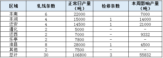 中商網訊:本周唐山18家232系列帶鋼廠30條帶鋼生產線中,3條帶鋼線檢修或停產,影響產量5.58萬噸,產能利用率為92.83%,較上周降低0.58%,28條帶鋼線開工生產,開工率90%,較上周降低3.33%。