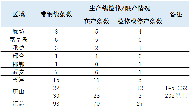 中商網訊:本周京津冀32家長流程帶鋼廠60條帶鋼生產線中,7條檢修或停產,影響產量18.80萬噸,產能利用率為86.95%較上周下降2.02%。28家短流程帶鋼廠33條帶鋼線中,13條檢修或停產,影響產量29.49萬噸,產能利用率41.73%較上周下降10.67%。