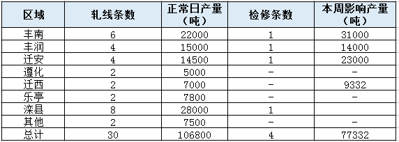 中商網訊:本周唐山18家232系列帶鋼廠30條帶鋼生產線中,3條帶鋼線檢修或停產,影響產量7.73萬噸,產能利用率為90.07%,較上周降低2.96%,28條帶鋼線開工生產,開工率90%%,較上周降低3.33%。