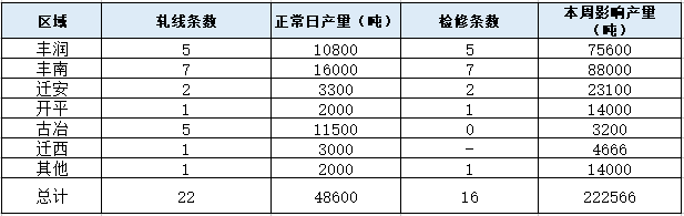 中商網訊:本周唐山18家145帶鋼廠22條帶鋼線中,16條檢修或停產,影響產量22.26萬噸,產能利用率為34.58%,較上周下降1.35%,6條帶鋼線正常生產,開工率為27.28%,較上周下降9.08%
