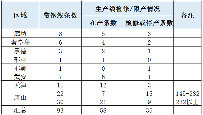 中商網訊:本周京津冀32家長流程帶鋼廠60條帶鋼生產線中,14條檢修或停產,影響產量37.12萬噸,產能利用率為74.23%較上周下降3.22%。28家短流程帶鋼廠33條帶鋼線中,20條檢修或停產,影響產量31.6萬噸,產能利用率37.56%較上周下降7.59%。