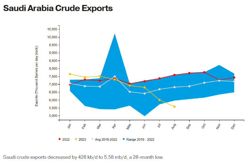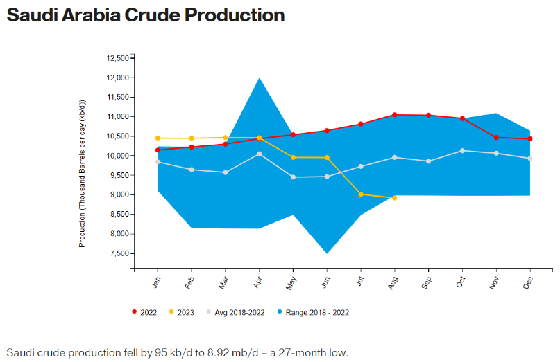 此外,沙特阿拉伯2023年8月的原油產量從7月份的901萬桶/天下降至890萬桶/天,已經是連續第五個月下降;并且比去年同期下降了19.3%。這一產量水平被認為是2021年6月以來的最低水平。
