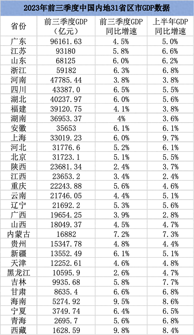 2023年前三季度中國內地31省區市GDP數據。制表:澎湃新聞;數據來源:各地統計局