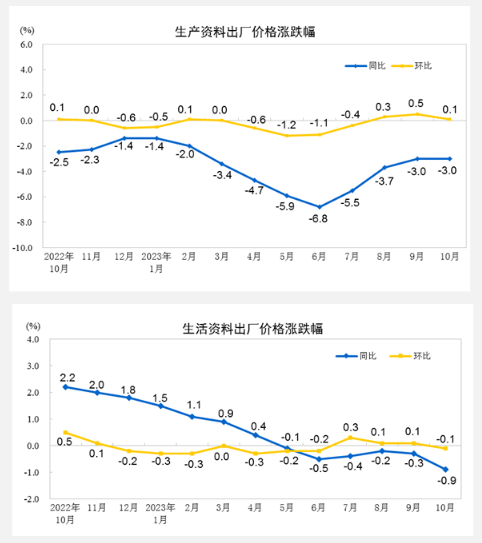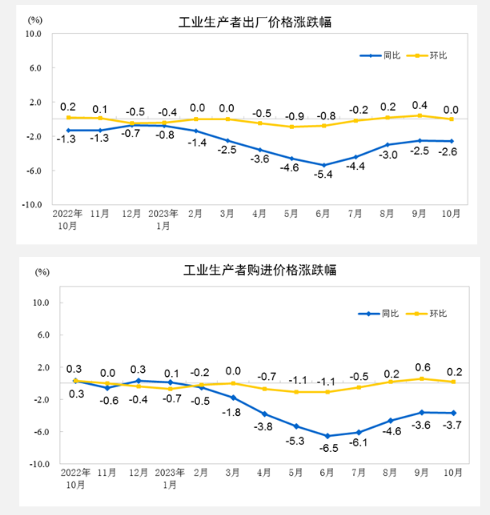 2023年10月份,全國工業生產者出廠價格同比下降2.6%,環比持平;工業生產者購進價格同比下降3.7%,環比上漲0.2%。1—10月平均,工業生產者出廠價格比上年同期下降3.1%,工業生產者購進價格下降3.6%。