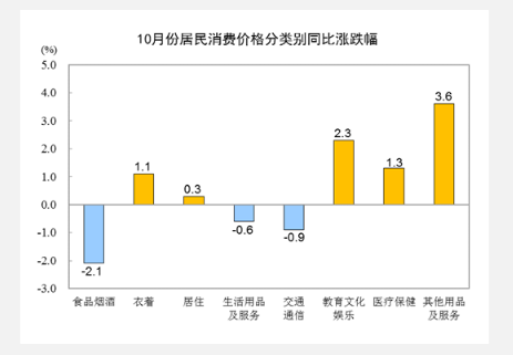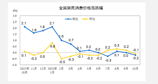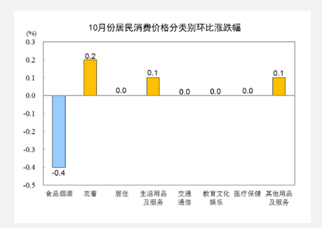 10月份,全國居民消費價格環(huán)比下降0.1%。其中,城市下降0.1%,農(nóng)村下降0.1%;食品價格下降0.8%,非食品價格持平;消費品價格下降0.1%,服務(wù)價格下降0.1%。