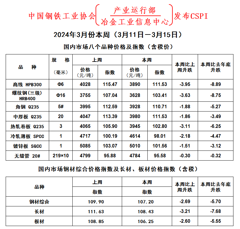 2024年3月份本周(3月11日-3月15日)國(guó)內(nèi)市場(chǎng)八個(gè)品種價(jià)格及指數(shù)