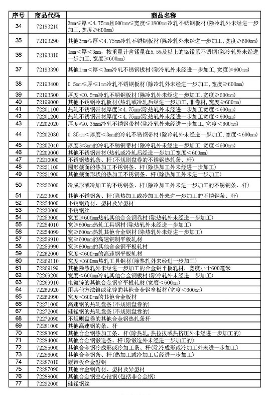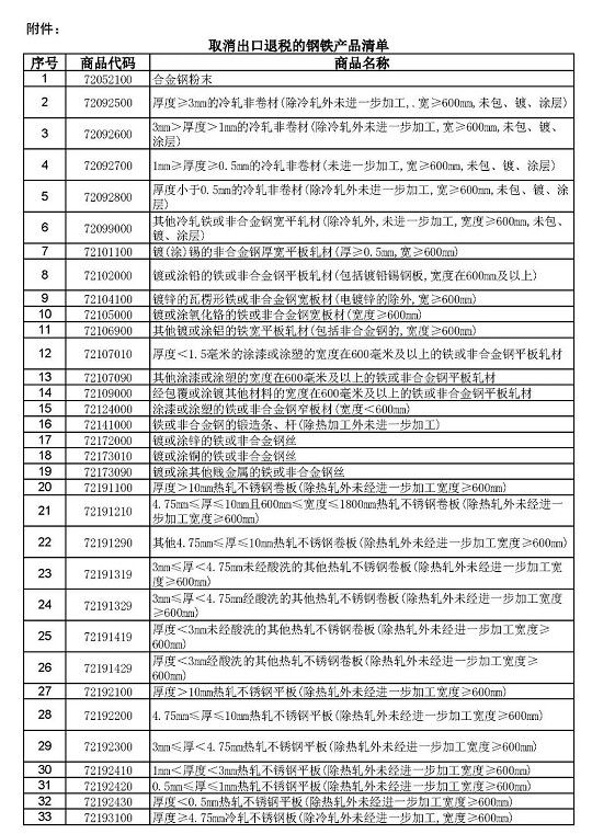 自2021年5月1日起,取消部分鋼鐵產品出口退稅。具體產品清單見附件。具體執行時間,以出口貨物報關單上注明的出口日期界定。