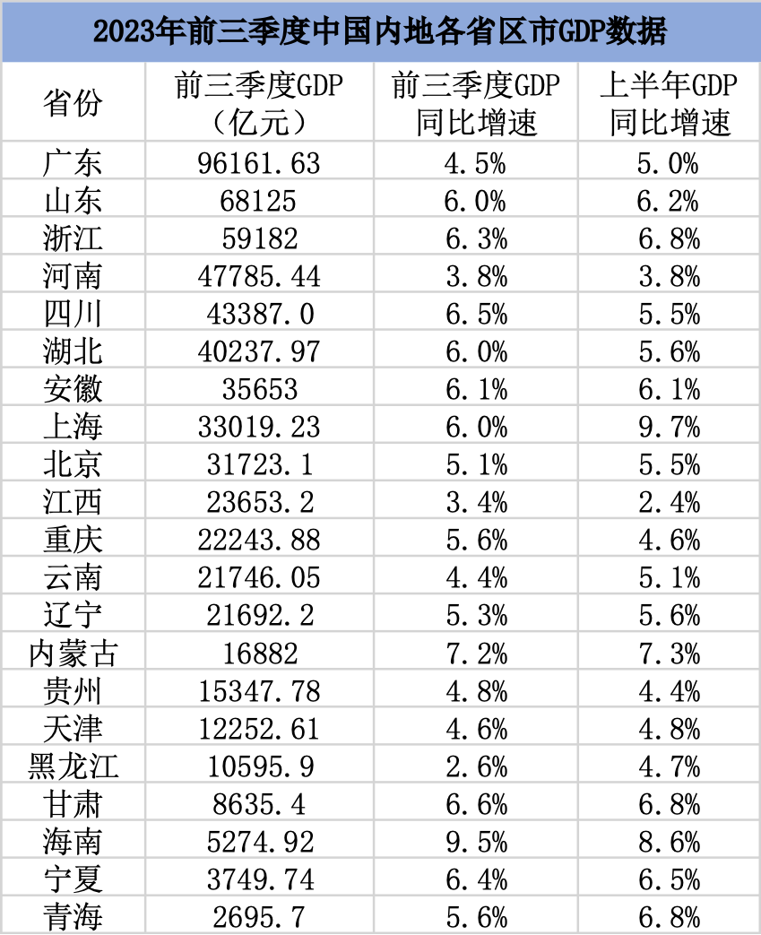 2023年前三季度中國內地各省區市GDP數據表來源:澎湃新聞、各地統計局