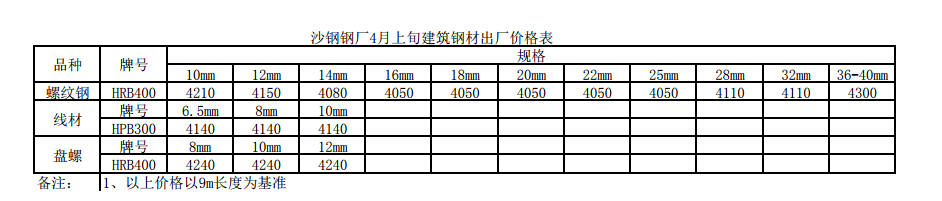 2019年沙鋼鋼廠4月上旬建筑鋼材出廠價格表執行