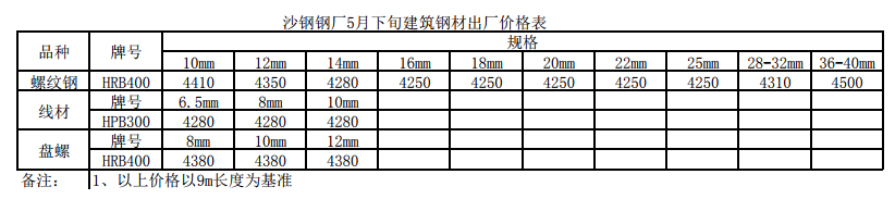 2019年沙鋼鋼廠5月下旬建筑鋼材出廠價(jià)格表執(zhí)行