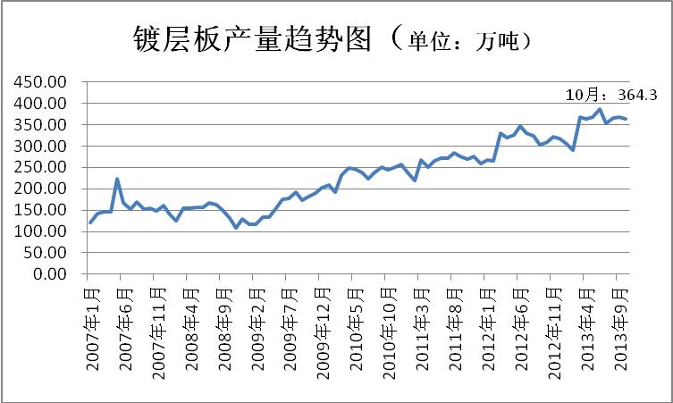 鍍層板10月產量為364.3萬噸,環比下降0.71%;同比增長17.78%。1-10月份國內共生產鍍層板3509.3萬噸。