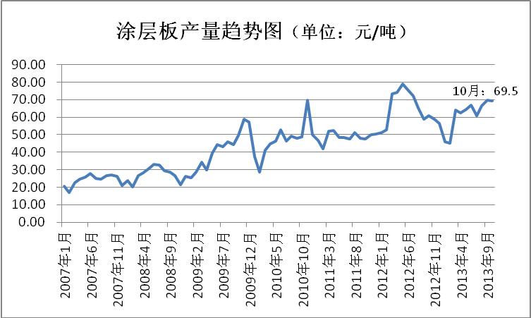 涂層板10月產量為69.5萬噸,環比下降0.57%;同比增長13.93%。1-10月份國內共生產涂層板622.6萬噸。