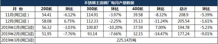 2019年2月份主流21家鋼廠同口徑不銹鋼粗鋼產(chǎn)量總量為177.24萬噸,環(huán)比減少9.01%。分系別來看,200系產(chǎn)量51.95萬噸,環(huán)比減7.76%,主要因春節(jié)期間聯(lián)眾、金匯、華樂等幾乎大部分鋼廠都有檢修或減產(chǎn)動作,導(dǎo)致產(chǎn)量環(huán)比減量;300系產(chǎn)量環(huán)比減幅7.66%,其中北海誠德、青拓集團環(huán)比減幅明顯,但廣青科技普碳鋼轉(zhuǎn)回至不銹鋼生產(chǎn),300系產(chǎn)量環(huán)比增加6萬噸左右;400系環(huán)比減幅最大達14.47%,幾大主流400系鋼廠產(chǎn)量均有小幅減少,主要因春節(jié)生產(chǎn)節(jié)奏放緩。2019年3月份同口徑預(yù)計總產(chǎn)量225.14萬噸,200系69.55萬噸,300系117.09萬噸,400系38.5萬噸,3月生產(chǎn)基本恢復(fù),產(chǎn)量預(yù)計環(huán)比大幅增加。