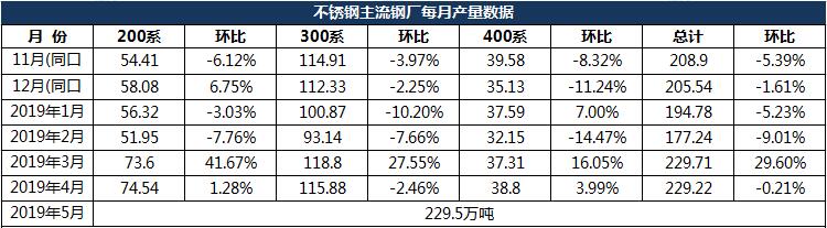 2019年4月份主流21家鋼廠同口徑不銹鋼粗鋼產(chǎn)量總量為229.22萬噸,環(huán)比微幅減少0.21%,同比去年增12.20%。分系別來看,200系產(chǎn)量74.54萬噸,環(huán)比增加1.28%,同比增15.9%,4月份廣青科技200系復產(chǎn),且聯(lián)眾、寶鋼德盛200系量略有增加,雖金匯檢修、青拓略減量,但總體環(huán)比產(chǎn)量略增;300系產(chǎn)量環(huán)比略減2.46%,4月份鋼廠300系生產(chǎn)成本較高,但盈利不甚理想,廣青部分產(chǎn)能轉至200系;400系環(huán)比增加3.99%,400系鋼廠總體維持高負荷生產(chǎn),產(chǎn)量維持高位。2019年5月份同口徑預計總產(chǎn)量229.5萬噸,200系75.5萬噸,300系111.6萬噸,400系42.4萬噸,5月排產(chǎn)較4月份相當,目前繼續(xù)維持300系略減,200、400系略增局面。