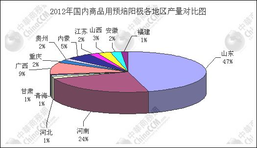 據中華商務網不完全統計,2012年商品用預焙陽極產量大省為山東,總產量約為316萬噸,其次為河南總產量約為166萬噸。