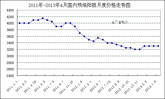 2013年4月國內(nèi)預(yù)焙陽極月度價格走勢圖 :