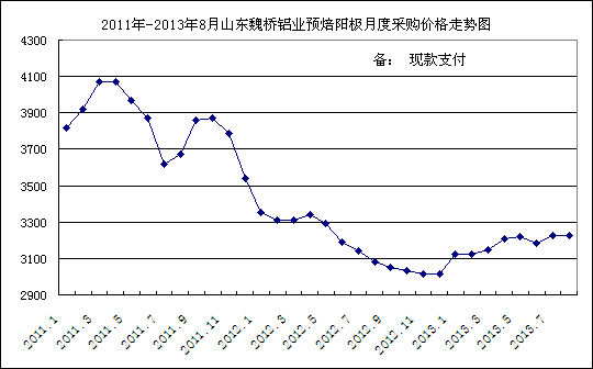 8月份山東魏橋鋁業(yè)預(yù)焙陽極采購價格3203-3223元/噸,較7月份持平。